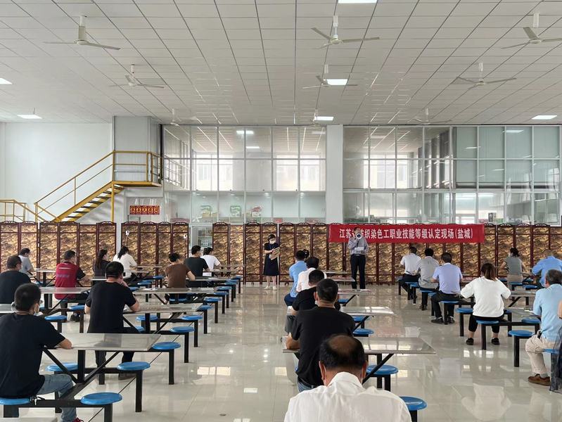 此次职业技能等级认定工作,考核内容为理论考试和现场操作考核两部分。评审组本着公平公正的原则,经严格认真考核,最终认定,56名操作工全部通过纺织染色工中级职业技能等级认定。江苏省纺织工业协会会长韩平、副会长顾文进、副秘书长潘捷、行业发展部副主任张彬等莅临现场,督阵指导。盐城市射阳鉴定中心主任李大刚等对评审认定过程进行了全程监督,结果公正有效。
