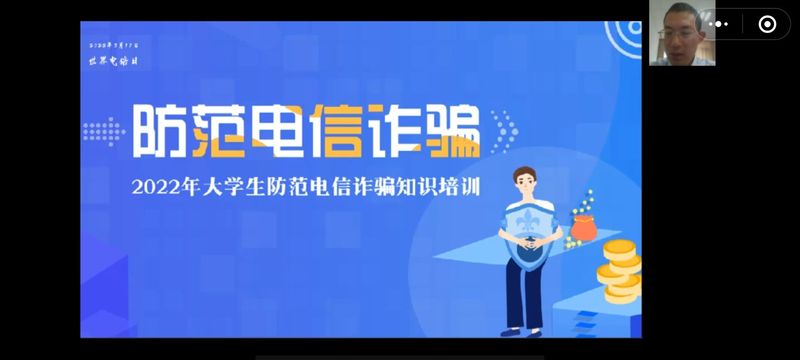在多彩的校园生活中往往潜藏着安全隐患,为培养新生安全防范观念,提高自我保护能力,构建平安、和谐、文明的校园,纺织学院根据《省教育厅办公室关于做好2022年大学新生安全知识教育宣传单发放工作的通知》要求,在9月28日下午开展 “防范电信诈骗” 线上知识培训,本次培训由纺织学院党总支副书记顾加强主讲,辅导员、22级全体新生参加。