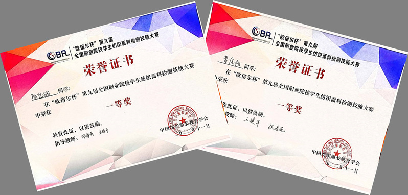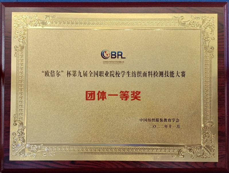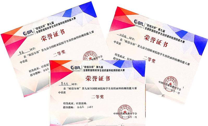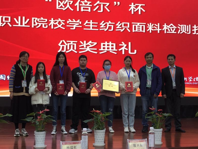 11月11-13日,“欧倍尔”杯第九届全国职业院校学生纺织面料检测技能大赛在浙江纺织服装职业技术学院举行。本次大赛由中国纺织服装教育学会主办,来自全国13所职业院校58名参赛选手经过两天激烈的角逐,顺利完成了全部比赛项目。纺织学院5名参赛选手沉着冷静,充分发挥出了应有的训练水平,比赛成绩创历届以来最佳,以团体总分第一名获大赛团体一等奖;纺检2031班陆佳楠和纺检203B班曹佳怡分别以第一名和第三名获比赛一等奖,纺检203B班曹遥、纺检203C班刘青梅、纺检203C班惠秀秀分获大赛二等奖的第一、第二、第六名。
