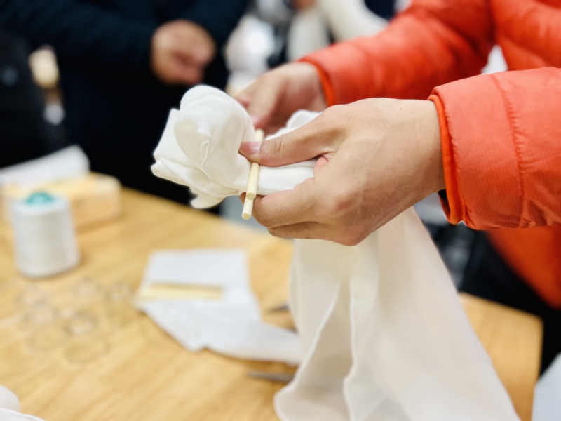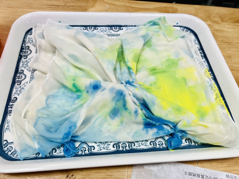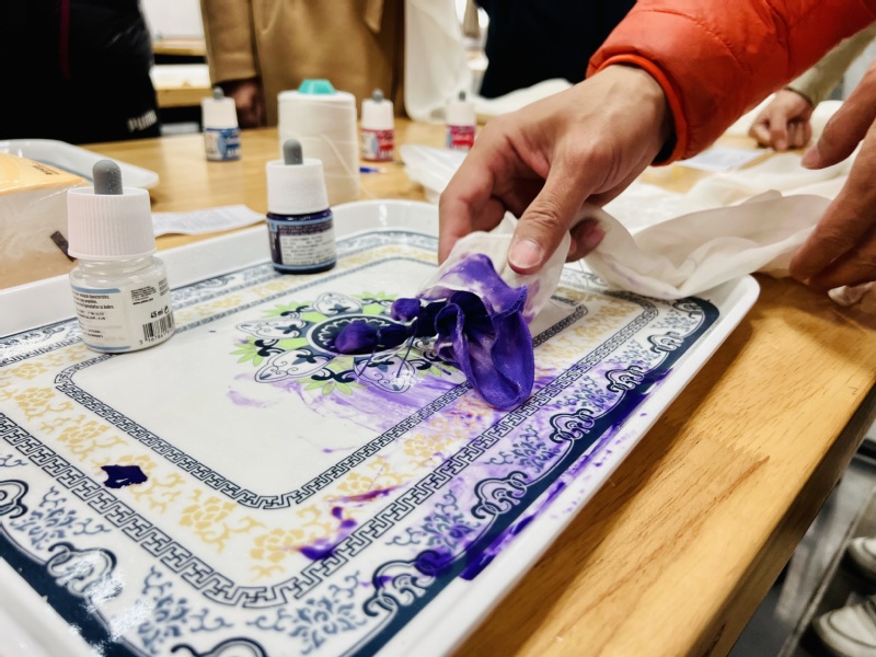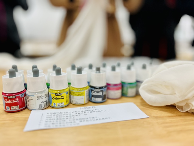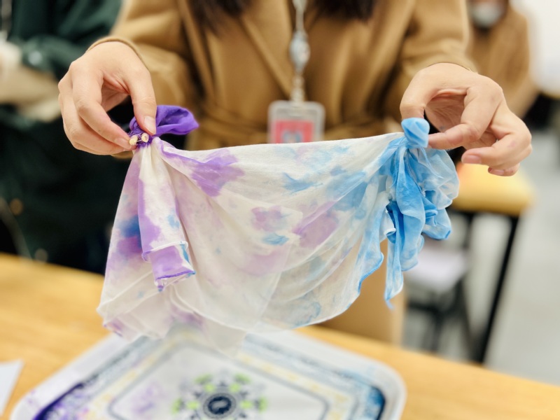 本次活动特别邀请了服装学院庄立新教授进行扎染指导,他介绍了扎染艺术的历史、扎结和染色的具体方法,并做了示范。随后,老师们开始动手体验,拿起了染料、丝巾、绳子等工具和素材,在庄教授的指导下开始艺术创想和创作。一道道工序过后,老师们的作品成功亮相了,在最后拆开的那一刻,是意想不到的惊喜,每块丝巾都成了独一无二的艺术品。