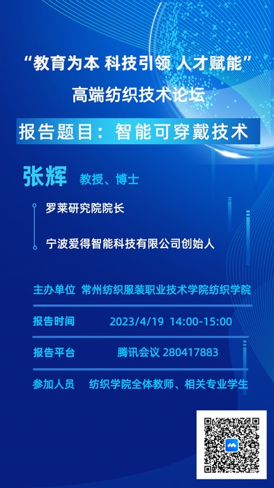 为深入贯彻党的二十大精神,适应新形势下专业面向产业高端,深化专业内涵建设、提档升级需求,纺织学院启动“教育为本、科技引领、人才赋能”高端纺织技术论坛活动,该活动围绕纺织产业智能可穿戴、高性能纤维材料、绿色低碳等主题开展一系列学术报告、现场走访、多方合作等内容。2023年4月19日下午,纺织学院邀请罗莱生活科技研究院院长、宁波爱德智能科技有限公司创始人张辉博士作题为《智能可穿戴技术》的学术报告。张辉博士是我校聘任的产业博士,在智能服装、可穿戴技术、纺织材料科技、家纺产品研发等领域具有深厚的产业经验。报告由纺织学院院长郭雪峰主持,纺织学院全体教师、相关专业学生聆听了报告。