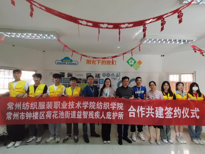 5月15日下午,常州纺织服装职业技术学院纺织学院党总支与常州市钟楼区荷花池街道益智残疾人庇护所进行了合作共建签约。荷花池街道总工会副主席黄一娟、益智园园长徐健、纺织学院党总支书记高妍、纺织学院党总支副书记史京军、纺织学院团委书记孟令彪及学生代表参加活动。本次活动由史京军主持。