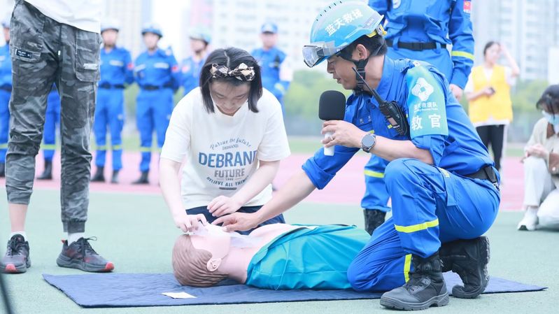 救援队教官对学生展开自救互救技能培训