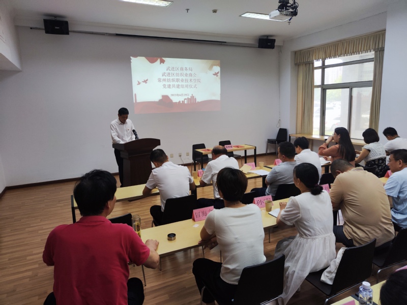仪式上,政会校领导分别对结对共建开展和进一步的发展给予了指导。常州纺织服装职业技术学院纺织学院党总支书记高妍介绍了我校与武进区纺织业商会的良好的合作基础和发展契机,介绍了纺织学院以立德树人为根本,以内涵建设为核心,以改革创新为动力,全力推进“五位一体”党建工作思路,介绍了纺织教师党支部的发展核心,希望通过合作深化校地、校企合作,深入推进产教融合工作。武进区商务局党组成员、副局长巢云方强调了纺织业是重要的民生产业,是产业转型升级、绿色发展、开放发展的重要力量,期望通过产学研政有机合作,构建“党建+创新”工作模式。工商联副主席、党组成员莫珺提出商会、政府、高校三方联动,通过党建引领,创新“服务”形式,通过组织联建、党员互动、活动互联、资源共享的有效合作,为纺织业高质量发展注入红色力量。