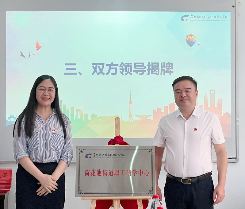 高妍表示,职工研学中心的成立是校地合作共建的新成果,进一步丰富了原有的合作共建内涵,将原有的志愿服务实践育人为主的工作拓展到教育培训社会服务范畴。党的二十大报告提出“健全现代公共文化服务体系,创新实施文化惠民工程”要求,纺织学院历来也十分重视师生文化素养与工匠精神的培育提升。她表示纺织学院在师资队伍力量,专业历史积淀、专业学术水平等方面拥有着得天独厚的优势,正好可以契合荷花池街道职工职业培训、技能竞赛、技能鉴定等实际需求,双方合作前景十分广阔。