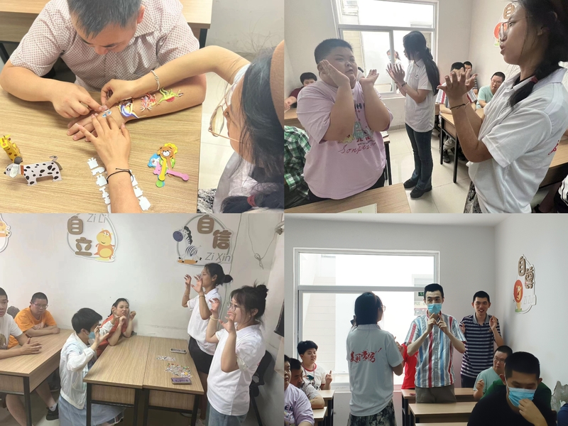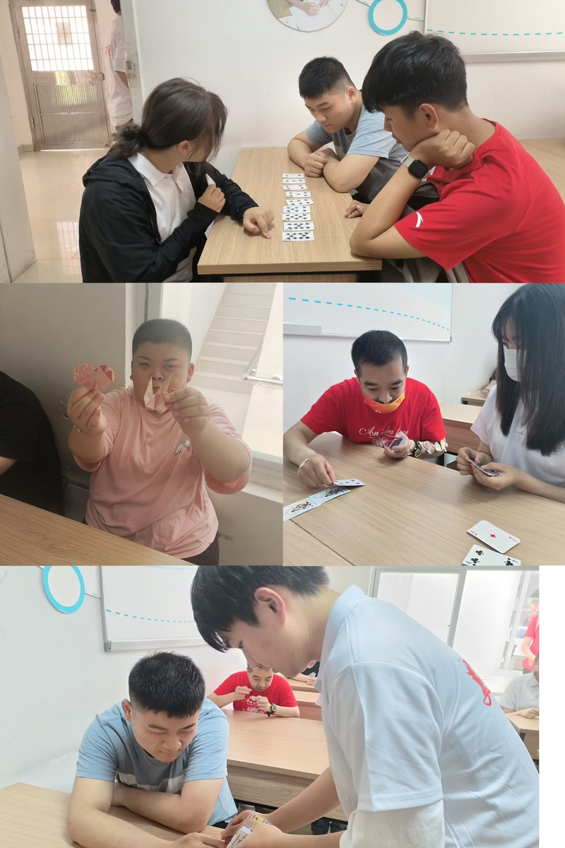 二是聚焦智育,提升学员智力水平。智育组成员依托益智类游戏(扑克牌、折纸和积木等),激发学员浓厚兴趣,同时也对学员智力提升提供帮助。智育组队长帅栾伟表示:智力障碍群体是每位当代青年都必须关心关爱的群体,智力开发是帮助该群体的有效手段,每位青年都应积极投入到助残行动中来。