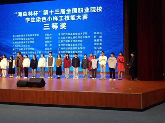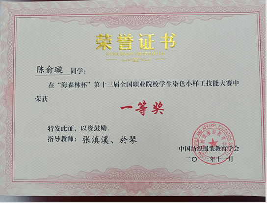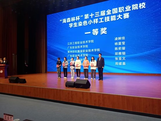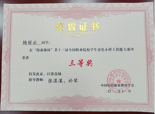 由中国纺织服装教育学会主办,山东轻工职业学院承办的“海森林杯”第十三届全国职业院校学生染整小样工技能大赛于2023年11月5日顺利结束。共有来自全国12所院校的61名学生参赛,纺织学院染整2131班陈俞璇同学获得一等奖,杨丽云获得三等奖。张滇溪,於琴两位老师获得优秀指导老师奖。