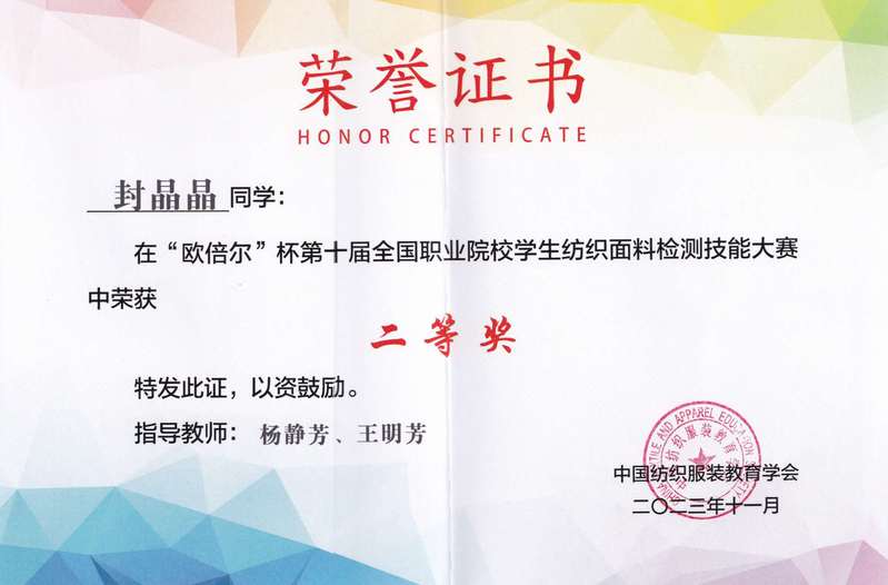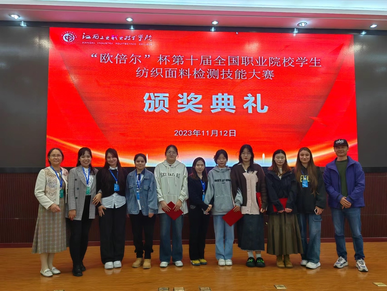 2023年11月10-12日,由中国纺织服装教育学会主办的“欧倍尔”杯第十届全国职业院校学生纺织面料检测技能大赛在江西工业职业技术学院举行,来自全国20所职业院校73名参赛选手参加了本次比赛。经过两天的激烈角逐,顺利完成了全部比赛项目。我校纺织学院王明芳、王建平、杨静芳老师指导的4名参赛选手在比赛中沉着冷静,充分发挥了应有的训练水平,并荣获佳绩。其中纺检2231班王凤文获得一等奖,封晶晶获得二等奖,卢启迪、戚雨汐获得三等奖。