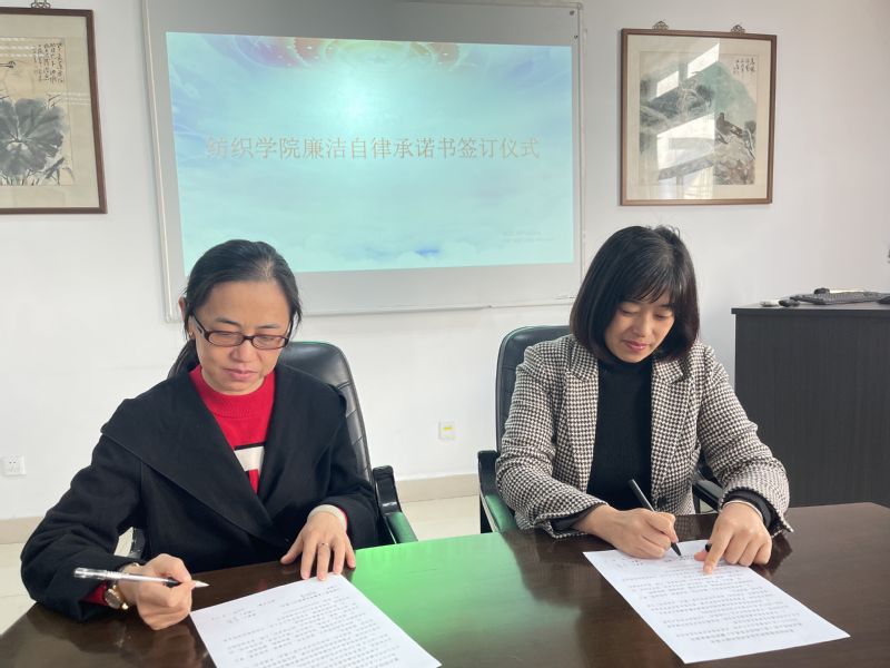 会上,纺织学院党总支书记高妍带领大家学习了学校廉政相关规章制度和高校系统违规违纪的典型案例。此外,为深化主题教育实效,落实党风廉政建设责任制,纺织学院举行了廉洁自律承诺书签订仪式,学院主要领导分别与重点岗位工作人员、教研室主任代表签订了廉洁自律承诺书,确保风险防控有制度、无死角。本次会议也对纺织学院全体教师提出了要求:提高思想认识,始终保持教师教书育人的崇高精神追求;坚守做人底线,共同努力营造良好的政治生态环境。