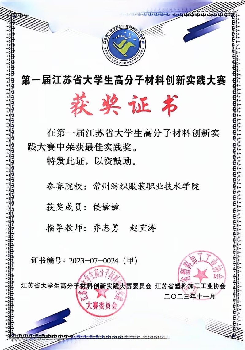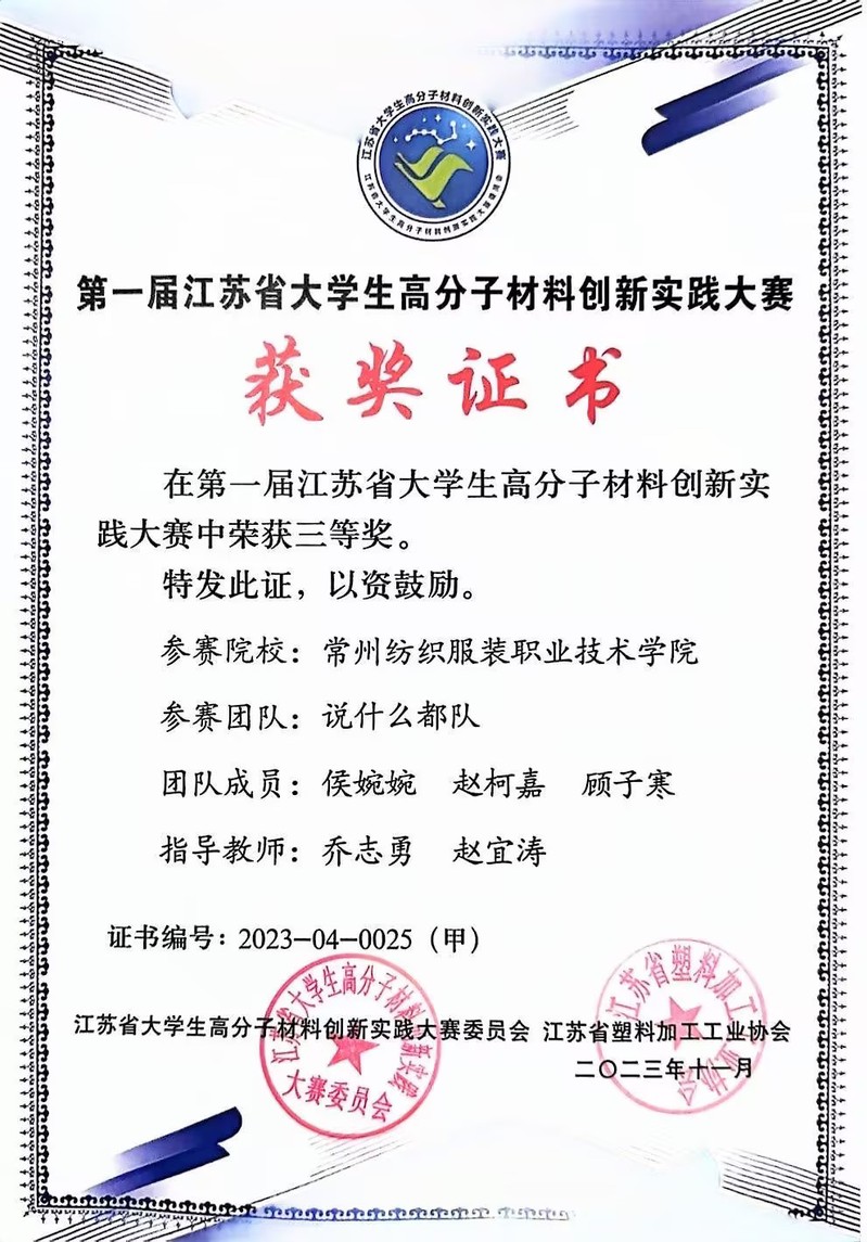 为进一步培养学生创新精神,提升学生专业综合实践能力,展示我校创新实践教育成果。2023年11月17-19日,纺织学院高分子材料智能制造专业学生代表队参加了在江苏理工学院举行的第一届江苏省大学生高分子材料创新实践大赛。