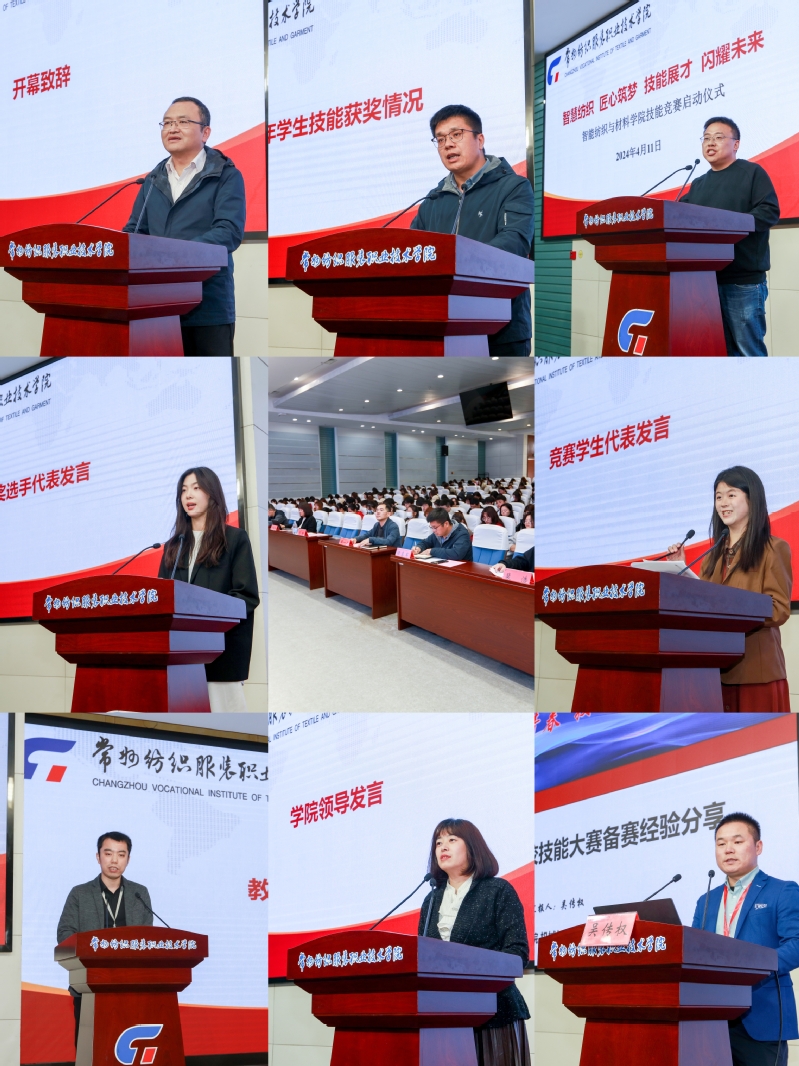 随后,侯喜军宣读了2023年以来师生在各级技能竞赛中获得的荣誉,并向获奖的师生表示了祝贺。教师代表陶磊和学生代表金晨晰、吕禹潼分别做了发言。陶磊从历史的角度探讨了实践在重大技能革新过程中的重要性,号召同学们踊跃参与技能竞赛,锻炼自己、展示自我。金晨晰、吕禹潼两位同学则分享了她们对于技能竞赛的感悟,并表达了对所有参赛选手的祝愿。郭雪峰通过案例分享表达了对未来技能型社会的期许,她的发言描绘了国家重视技能、社会崇尚技能、人人学习技能,人人拥有技能的美好前景,并宣布智能纺织与材料学院技能竞赛月正式开启。