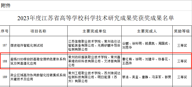 在刚刚公布的省教育厅“2023年度江苏省高等学校科学技术研究成果奖”名单中,智能纺织与材料学院曹红梅、刘建平、张春花团队和常州喜莱维纺织科技有限公司、艾诗丽有限公司合作开展的“超低COD排放的高稳定微纳色素体系构筑及其高值化应用”项目荣获三等奖。