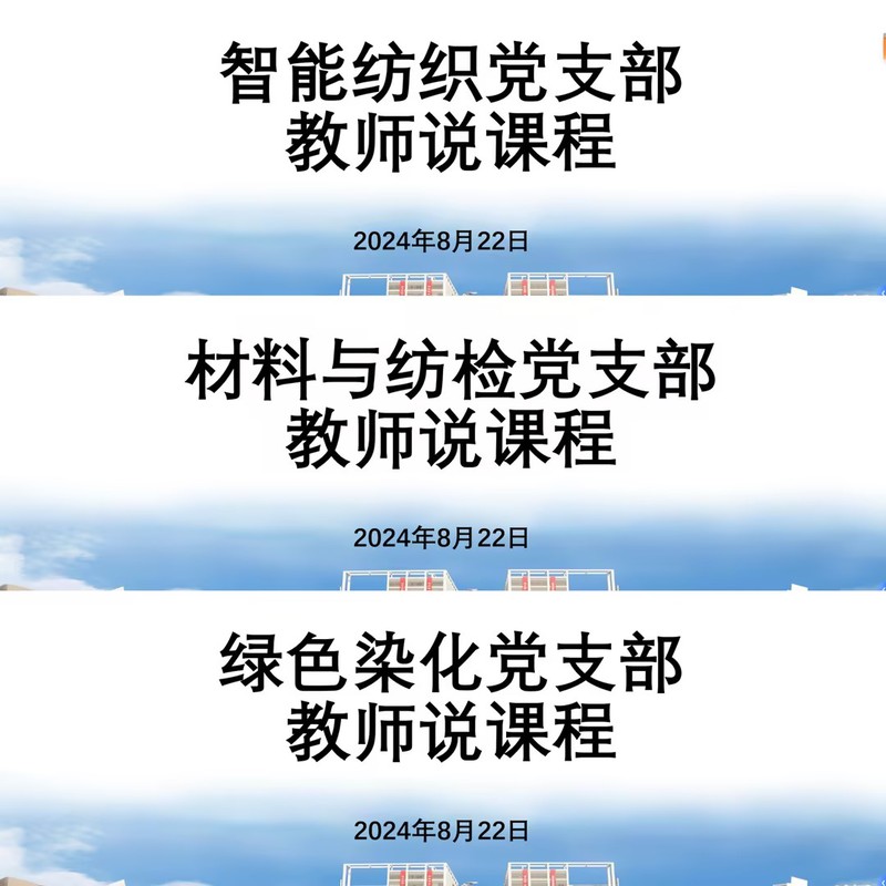 各专业党支部(智能纺织党支部、材料纺检党支部、绿色染化党支部)发挥党建引领专业建设作用,要求各专业认真组织,所有专业老师精心准备,按期开展专业团队讨论、总结提炼特色,做好汇报材料。8月22日,各支部开展线上三说活动,活动由各支部书记主持,组织专家评审,所有专业老师参加学院汇报遴选,并根据专家指导意见,继续完善汇报内容。