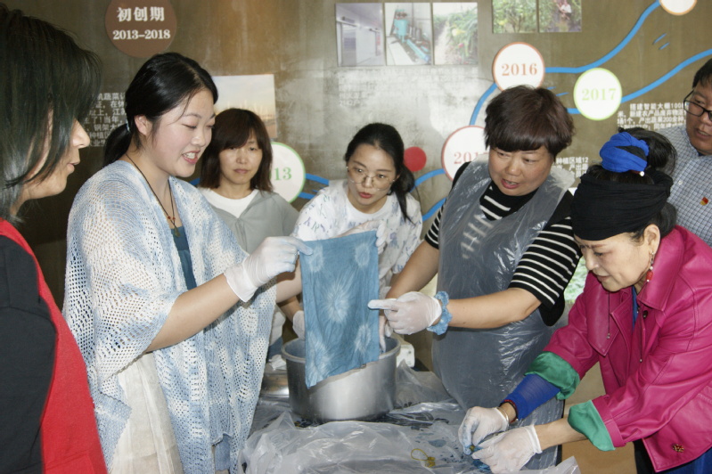 侯喜军、史京军、缪华峰、丁爱芳共同为“劳动教育实践基地”揭牌。常州纺院织韵染艺社展示了部分作品,并现场示范了扎染基本技法,并详细介绍了扎染工具和材料的使用方法。大家纷纷动手参与体验扎染制作,在实践中感受劳动的乐趣与价值。