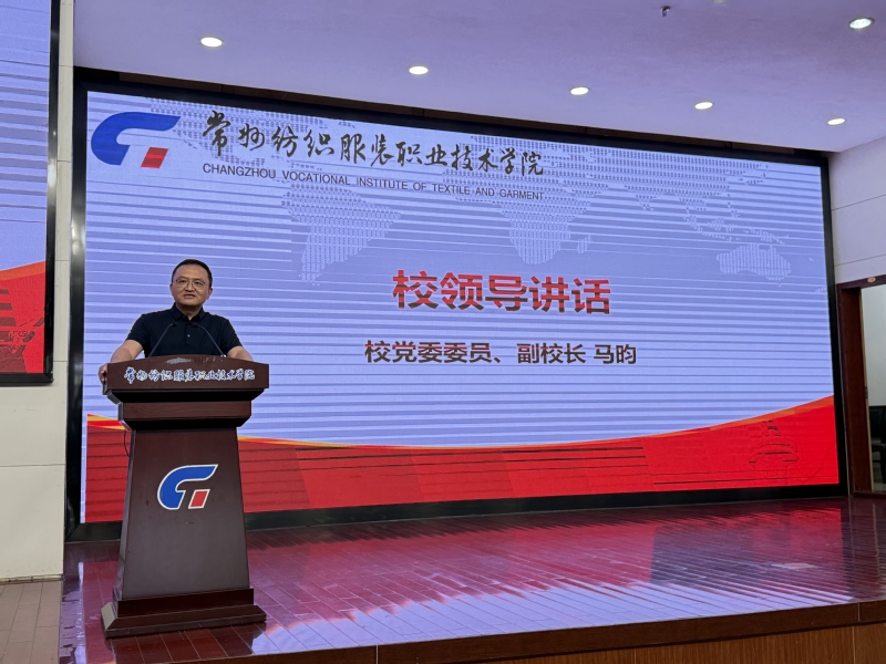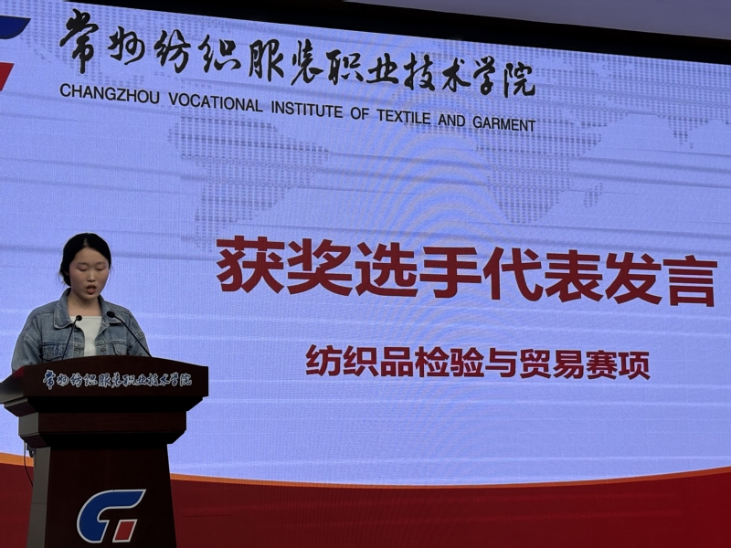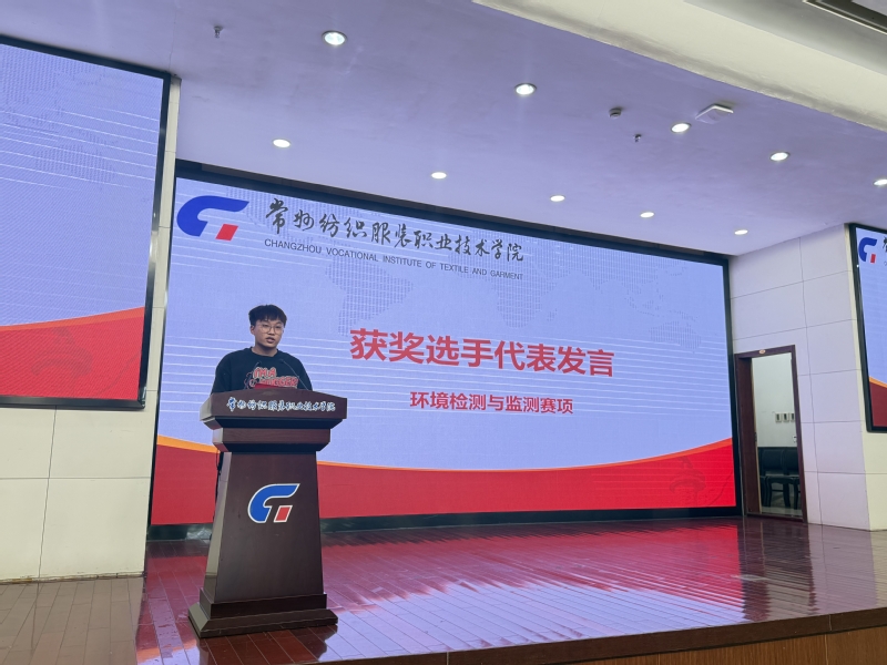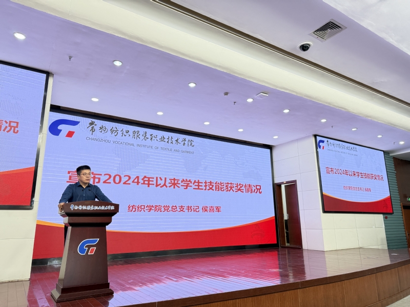 智能纺织与材料学院党总支书记侯喜军回顾了2024年以来学生在各级技能赛事中取得的优异成绩,涵盖纺织品检验与贸易、化学实验技术、环境检测与监测等赛项,并表彰了获奖学生及团队的创新精神与专业能力。