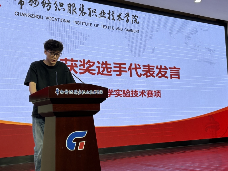 在经验分享环节,省技能大赛获奖选手代表依次登台发言。纺织品检验与贸易赛项获奖选手施睿明同学表示,备赛过程不仅强化了专业技能,更锤炼了团队协作与抗压能力;化学实验技术赛项获奖选手孙德政同学则从细节出发,分享了实验设计与操作规范的重要性;环境检测与监测赛项获奖选手陆寒松同学则从“实战应变”角度出发,剖析了现场突发问题处理的策略。指导教师代表周子涵博士,提出“以赛为镜、以技为媒”的教学理念,强调竞赛对教学反馈的积极作用,并呼吁更多教师参与指导,助力学生突破自我。