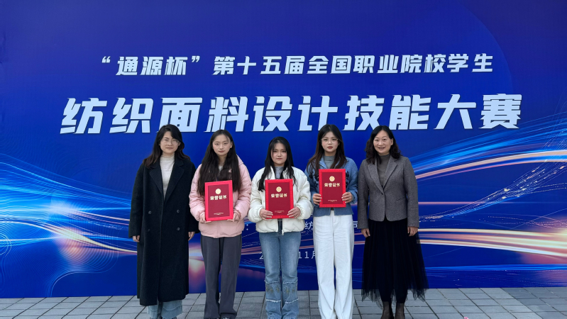我校智能纺织与材料学院纺织品设计专业朱新月、童婉如、舒诗寒三位同学(指导团队:孙宏、张志清、翟胜男、周颖等)表现卓越。赛场上,三位选手沉着自信,以娴熟技能和出色表达,将作品理念特色完美呈现,获评委一致好评,诠释了追求卓越的工匠精神。最终,斩获一等奖1项、二等奖1项、三等奖1项,尽显纺院学子扎实专业功底与勇于创新风貌。成绩取得的背后,是学院的高度重视与全方位支持,从实训场地安排、设备保障到后勤服务,为参赛团队筑牢后盾;是指导团队老师的全力以赴,围绕配色设计、结构设计等方面反复打磨作品。