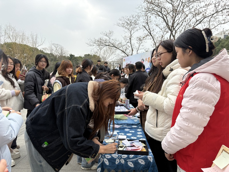 活动现场秩序井然,环节设置紧凑且富有新意,全程分为匠心手作·扎染体验、心愿寄语·温馨小抽奖、作品展示·集体合影三个阶段。在核心的扎染体验环节,工作人员手把手带领同学们完成每一个步骤,打造出独一无二的个人扎染作品。心愿寄语环节同样温馨满满,同学们手持便笺,写下女神节的美好祝福张贴至节日主题留言墙,形成了一道别致的视觉风景。完成留言的同学还可参与温馨抽奖,为现场增添了不少趣味与惊喜。活动尾声,优秀扎染作品集中亮相,参与者们纷纷拍照打卡,定格下这场非遗与节日碰撞的美好瞬间。