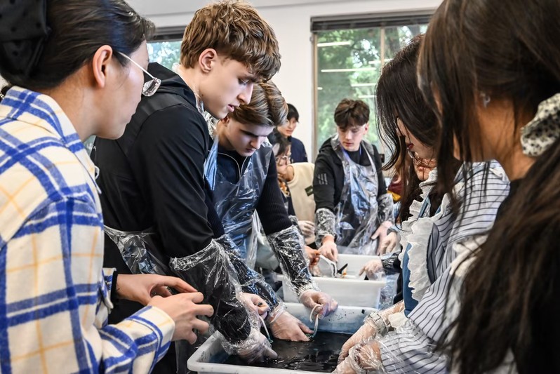 为深化中德青少年文化交流,传播中华优秀传统文化,4月3日,“锦绣江苏·国际青少年交流营”常州纺织服装职业技术学院站活动顺利开展,德国柏林两所中学的36名师生走进校园,沉浸式体验中国纺织非遗魅力,共架跨文化交流桥梁。常州市教育局副主任蒋玥、国际学院院长何彦、副院长韩瑞,学院党总支书记侯喜军、副书记史京军等参加活动。