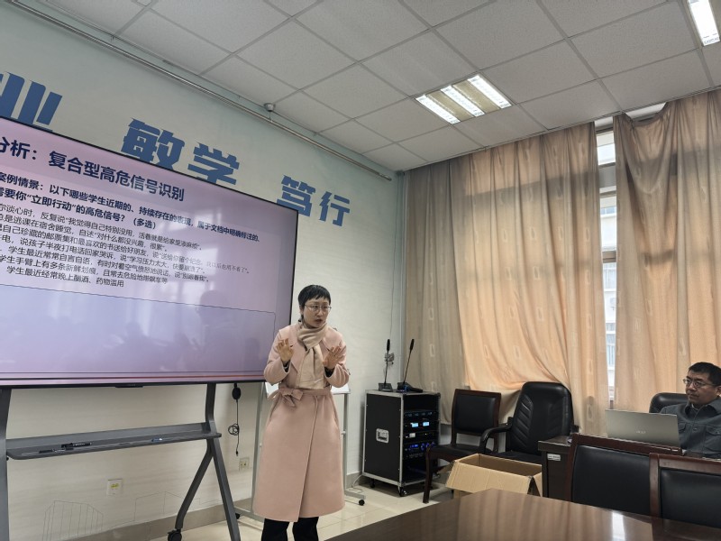 鞠慧指出,在当前社会转型期,学生心理问题呈现“四维叠加”特征,班主任作为学生工作的“第一响应人”,需重点关注学生2至4周内持续存在的异常变化。通过“案例纠错”与“实战演练”,她详细拆解了“一报二保三联四交”的标准化口诀,特别纠正了教师在危机干预中易出现的“公开泄密”及“言语刺激”等误区。培训强调,发现“表达死亡意念”“搜索自杀方式”“赠送贵重物品”等复合型高危信号时,必须立即启动一级响应,遵循“生命至上、安全第一”的原则,确保应急处置有序高效。