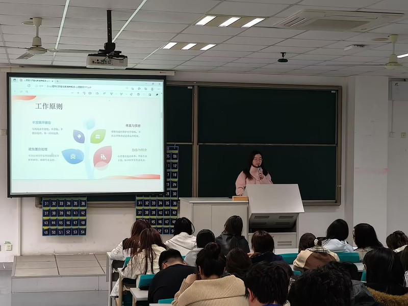 学生专场培训在4A201教室同步开展,由心理辅导员张程晨主讲。针对宿舍长和心理委员“身处一线、朝夕相处”的特点,培训明确了其作为“心灵哨兵”的角色定位。